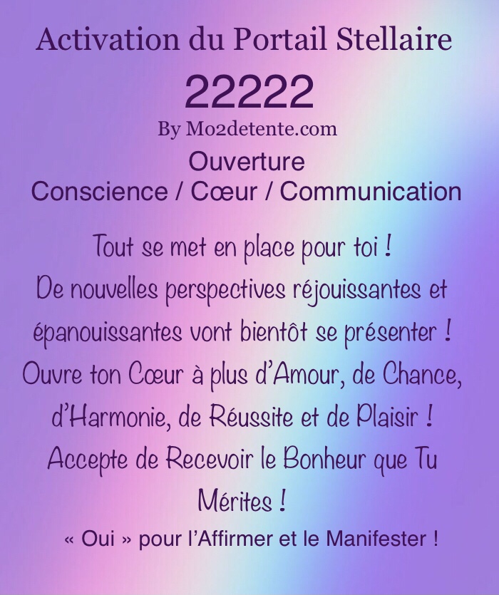 Et celui de lâarticle sur le Portail 222222 https://mo2detente.com/2022/02/19/%f0%9f%92%ab%f0%9f%92%96%e2%9c%a8-le-grand-portail-stellaire-20-22-02-2022-%e2%9c%a8%f0%9f%92%96%f0%9f%92%ab/